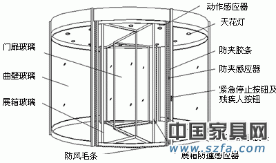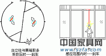 1、防撞感應器:安裝在每個展箱頂上的前部,探測到行人后,旋轉門會馬上停止,防止門體撞傷行人,行人走開后旋轉門恢復正常;