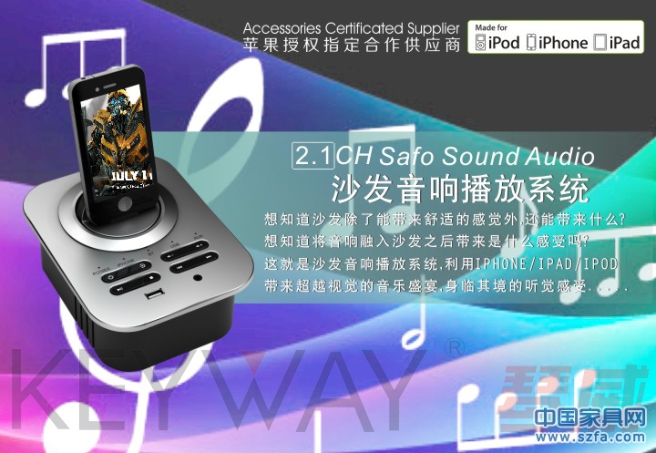 我司(佛山市順德大良威名電器有限公司)設(shè)計(jì)生產(chǎn)的2.1CH嵌入式沙發(fā)音響放器系統(tǒng),用戶(hù)可將它嵌入沙發(fā)中,安裝方便快捷,是沙發(fā)也是ipod/ipad/iphone音響,我司是直接蘋(píng)果公司授權(quán)的指定合作供應(yīng)商,內(nèi)置了直接蘋(píng)果公司授權(quán)的無(wú)線(xiàn)視頻解碼器功能,通過(guò)2.4G高清無(wú)線(xiàn)視頻輸出,讓嵌入沙發(fā)音響播放器與電視機(jī)同步演繹,視頻高清流暢,品質(zhì)卓越,音質(zhì)純正優(yōu)美。讓用戶(hù)在家也可以享受到頂級(jí)的視聽(tīng)盛宴。