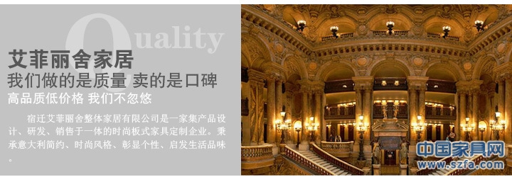 宿遷艾菲麗舍整體家居有限公司是一家集產(chǎn)品設(shè)計(jì)、研發(fā)、銷(xiāo)售于一體的時(shí)尚板式家具定制企業(yè)。秉承意大利簡(jiǎn)約、時(shí)尚風(fēng)格、彰顯個(gè)性、啟發(fā)生活品味。 若需定做服務(wù):則產(chǎn)品的尺寸、材料、顏色均以客戶(hù)需求而定,我們亦可提供材料小樣品、材料色卡供客戶(hù)選擇。 |