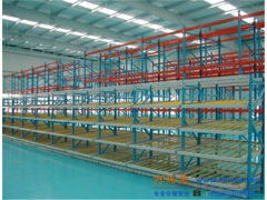 流利式貨架結(jié)構特點:流利式貨架的流利條直接連接到前后橫梁及中間支撐梁上,橫梁直接掛在支柱上,流利條安裝傾斜度取決于貨箱的尺寸、重量以及流利架的深度,通常取5%~9%。流利條滾輪的承載力為6kg/只,當貨物較重時,可以在一個滾道安裝3-4根流利條。通常在深度方向上每隔0.6m安裝一根支撐梁以增加流利條的剛度。當滾道較長時,可用分隔板將滾道隔開。取貨端需安裝制動片使貨物減速,降低沖擊。