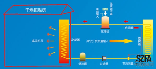 高溫?zé)岜煤娓蓹C(jī)組,主要有翅片式蒸發(fā)器(外機(jī))、壓縮機(jī)、翅片冷凝器(內(nèi)機(jī))和膨脹閥四部分組成,通過讓工質(zhì)不斷完成蒸發(fā)(吸取室外環(huán)境中的熱量)→壓縮→冷凝(在室內(nèi)烘干房中放出熱量)→節(jié)流→再蒸發(fā)的熱力循環(huán)過程,從而將外部低溫環(huán)境里的熱量轉(zhuǎn)移到烘干房中,冷媒在壓縮機(jī)的作用下在系統(tǒng)內(nèi)循環(huán)流動(dòng)。它在壓縮機(jī)內(nèi)完成氣態(tài)的升壓升溫過程(溫度高達(dá)100℃),它進(jìn)入內(nèi)機(jī)釋放出高溫?zé)崃考訜岷娓煞績?nèi)空氣,同時(shí)自己被冷卻并轉(zhuǎn)化為流液態(tài),當(dāng)它運(yùn)行到外機(jī)后,液態(tài)迅速吸熱蒸發(fā)再次轉(zhuǎn)化為氣態(tài),同時(shí)溫度可下降至-20℃~-30℃,這時(shí)吸熱器周邊的空氣就會(huì)源源不斷地將熱量傳遞給冷媒。
