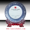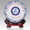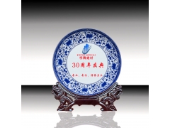 青花是單一的色彩,用單一的色彩去體現(xiàn)豐富的內(nèi)容。這在手法的運(yùn)用上,往往需要借助一些青花以外的東西來達(dá)到。而這青花以外的東西,就是瓷的“白”。青花正是藍(lán)、白之間的藝術(shù)。我們要用青花去描繪山水,正是運(yùn)用了瓷的白,才能顯現(xiàn)出山水的立體感和層次感。除此以外,當(dāng)今許多現(xiàn)代的畫師也還常常運(yùn)用點(diǎn)睛之筆來體現(xiàn)它的韻味。如畫荷塘的一角,對(duì)于荷花,常常以紅色來點(diǎn)綴。又如在荷葉上畫一只蜻蜓,對(duì)蜻蜓的眼睛,用黃色來點(diǎn)綴。這種點(diǎn)綴使整個(gè)構(gòu)圖顯得豐滿和有立體感、層次感,也增加了它的韻味。當(dāng)然青花陶瓷紀(jì)念盤構(gòu)圖的立體感和層次感,也可以通過用色的濃淡來體現(xiàn)。使單色調(diào)呈現(xiàn)在人們面前的是一個(gè)完整、生動(dòng)、豐滿的畫面,所以陶瓷紀(jì)念盤,是一個(gè)表達(dá)藝術(shù)和情感的載體,也是一種心靈寄語的永恒,在陶瓷紀(jì)念盤上面燒制您心中的圖案和美好的寄語來表達(dá)給友人給親人的一種美好的祝福。