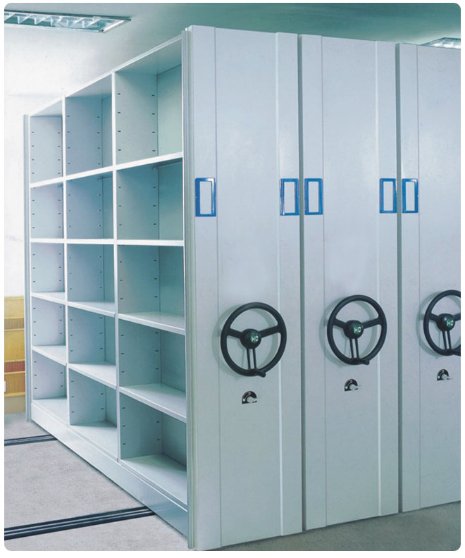 全封閉密集柜基座整體焊接合拼,架體為特殊立板插入結構,立板中開有掛孔;擱板扣置于掛孔上;每層擱板一分為二,雙面擱板間距可分別上下調節(jié)。每節(jié)雙面間以整板分隔開。 側面板可采用凹凸式護板或三段式護板,該樣式密集架適用于要求承重大且密封要求高的庫房,被稱為“全封閉”型。