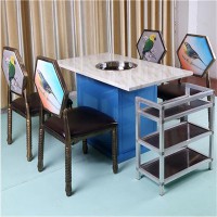 火鍋?zhàn)赖呐_(tái)面是由石英石組成,桌腳由鑄鐵組成或者不銹鋼組成。