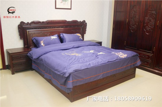 床頭柜上下兩個(gè)抽屜,與床箱雕刻相統(tǒng)一,手工打磨的元寶型凹槽拉手,