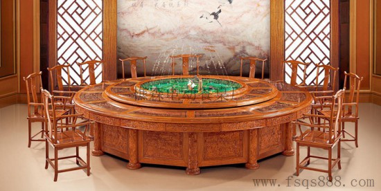 【功能介紹】:電動功能,即桌子的轉(zhuǎn)盤是在電動機的驅(qū)動下進行旋轉(zhuǎn),轉(zhuǎn)速可調(diào),方便用餐人員,夾取食物菜肴,遙控器控制或手動開關(guān)控制旋轉(zhuǎn);另可增設旋轉(zhuǎn)式電磁爐、電動音樂噴泉等功能。免費配有2個遠程遙控器,方便侍者服侍。中間放置山水噴泉景觀,水流在滾運石的旋轉(zhuǎn)下飛濺,池中可放置五彩石和金魚,另外可打開音樂功能,增加別樣用餐氛圍。