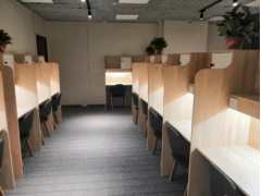 聯(lián)排書桌上豎著一道道高隔板。每個獨立的空間都不大,有插座和柜子。