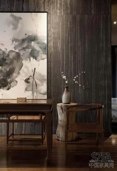 二樓展示廳設(shè)計師以「回歸」、「內(nèi)省」的出發(fā)點,選擇寧靜、樸實的人文禪風(fēng),廳內(nèi)僅擺著一件根雕,整面六米的墻面上則是用來投影展示。