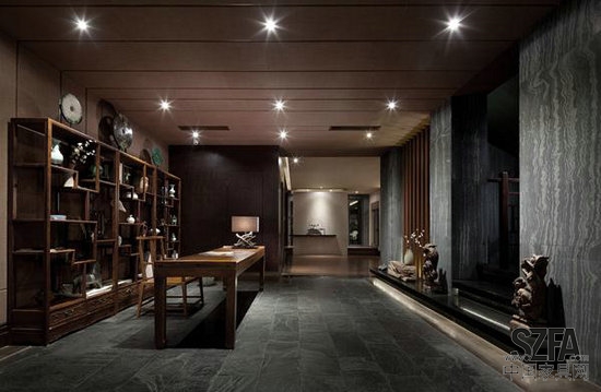 我們追求的是表面的質(zhì)感和肌理,不同質(zhì)感和肌理的材質(zhì)對比正如同不同形體體塊的互相對話,為了暖和硬朗的材質(zhì),設(shè)計師在細(xì)節(jié)之處為用心,無論是走道上看似隨意擺放的佛像、枯枝,還是那些做工精良的中式家具、置于展示柜內(nèi)的精美瓷器與茶具,這些細(xì)微之處的累積都讓空間顯得更為飽滿。