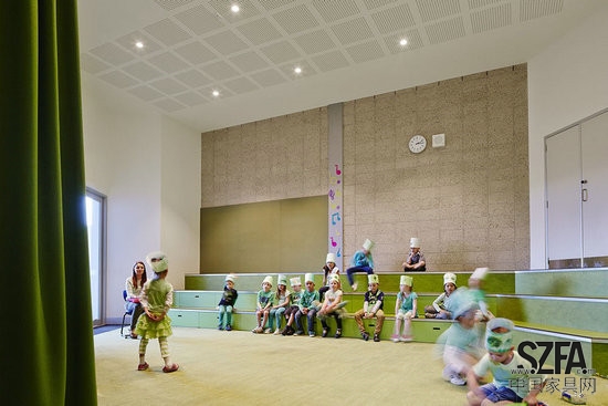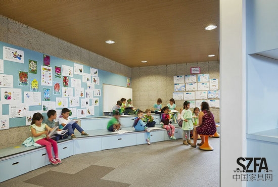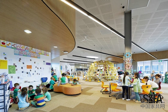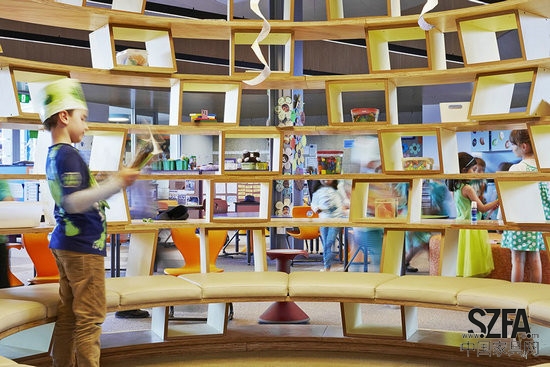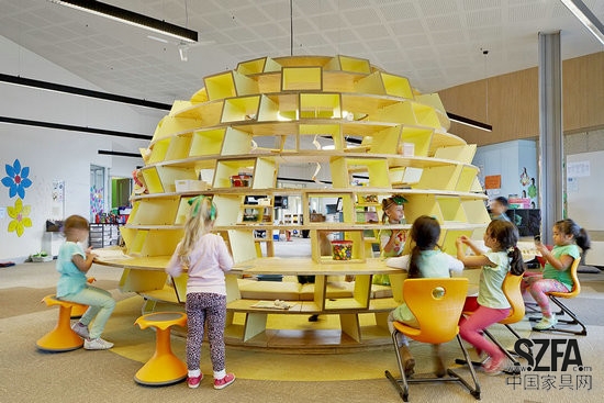 “蜂巢”還提供機(jī)會(huì)或交談空間。里面的座位為孩子們提供了“隱蔽的空間”,可以用來(lái)進(jìn)行討論、玩游戲,或者只是在這里做功課。在“蜂巢”頂部開(kāi)口有個(gè)圓形熒光燈,照明極佳。不同顏色的地毯也為“蜂巢”劃定“特殊”區(qū)域。