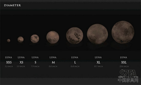 Luna月神燈,主要采用玻璃纖維和無毒膠乳制作而成。全系列月神燈共有七個不同的尺寸,除了最小的XXS配備LED燈和電池外,其余尺寸都標配鹵鎢燈泡和線控開關,可以自由調節(jié)五檔亮度,并且可以懸吊起來作為吊燈使用。