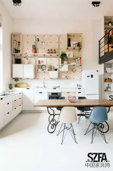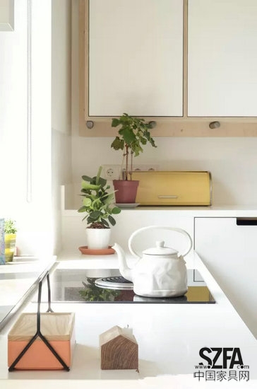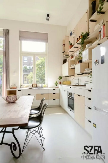 客廳另一端便是開放式的廚房與客廳,高挑的天花板,即使全家人在一起,但仍然有一點隱私。米白色的廚房與原木結(jié)合,墻上的隔板既能夠存儲東西,又成為很好的擺設(shè),一些綠植的點綴,更為可愛。