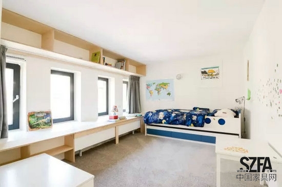 兒童房的設(shè)計,以寬闊為主,給孩子充分的想像空間和自由空間。墻上貼著孩子自己的作品,這也是一種裝飾的巧妙方式。整個房間充滿童趣,想必也是孩子們的天堂。