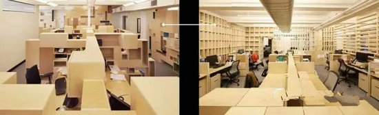 Taylor and Miller為他們開(kāi)發(fā)了辦公室隔墻和家具系統(tǒng),都是由不同尺寸和直線形狀的基本膠合板箱做成的。由多個(gè)隨機(jī)的方式安排的盒子組成了隔墻,這樣就允許了空間中的視覺(jué)連通性,當(dāng)移動(dòng)到新的空間后,原來(lái)的盒子被重新組織,用了單一的盒子形狀來(lái)搭建整面隔墻。對(duì)于設(shè)計(jì)師來(lái)說(shuō),這個(gè)想法是:隨著辦公室的擴(kuò)展,在新的空間里增加了更多的勞動(dòng)力,在人口密度增加和任務(wù)有重疊的情況下,辦公有一定程度的紊亂,該建筑體系的設(shè)計(jì),將抵消這一混亂走向;盒子的重復(fù)性和紋理將這個(gè)工作間與下一個(gè)工作間分開(kāi),給員工提供了一個(gè)安靜的空間和隱私分層。