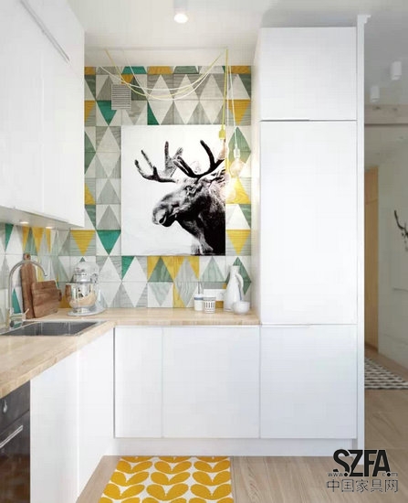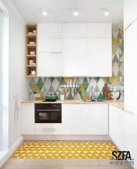 在對(duì)面,是廚房墻面和白色存儲(chǔ)柜。雖然很小,但廚房意味深長(zhǎng)上的擋板、地板上的亮黃色墊子以及墻上五彩的瓷磚都是亮點(diǎn)。