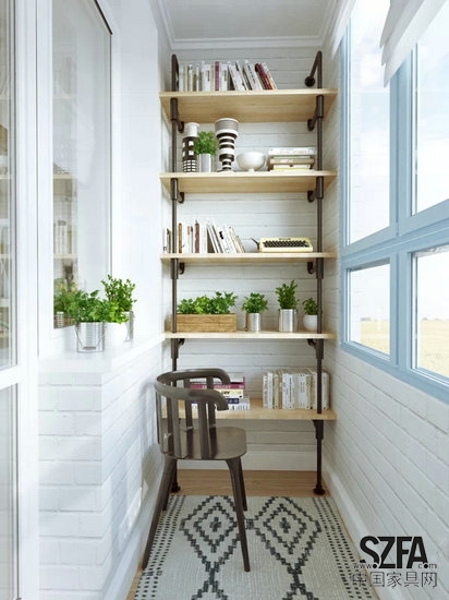 走廊的另一邊是一個(gè)小型圖書(shū)館和鐵皮溫室,為客戶配備一個(gè)椅子,看看窗外,窗戶天藍(lán)色鑲邊也會(huì)讓人心情舒適。