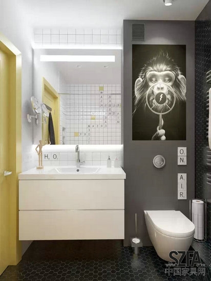 打開(kāi)浴室的門(mén),右手邊是浴缸,左手邊是洗手盆和馬桶。你萬(wàn)一不知道這房間是做什么的,那么你所要做的就是閱讀浴缸邊瓷磚中的拼字圖案。又是一個(gè)在角落里的樂(lè)趣,這些有趣的小創(chuàng)意歸功于設(shè)計(jì)師的功力。