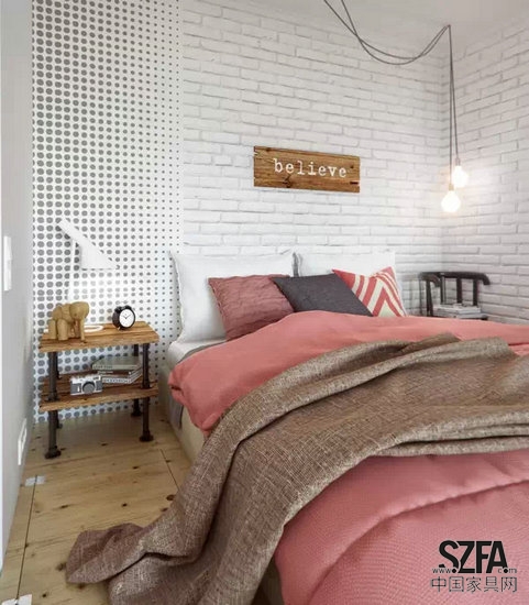 該平臺(tái)帶來(lái)了額外的存儲(chǔ)空間,因?yàn)榉块g里的衣柜里是很小的。磚墻上的現(xiàn)代釘子提供了額外的懸掛空間。