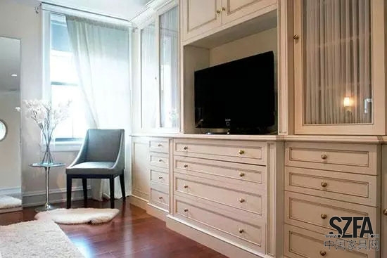 定制衣柜與客廳中的書柜異曲同工,同樣在中間區(qū)域留出了電視的位置,充分利用空間,解決了臥室中的收納問題。