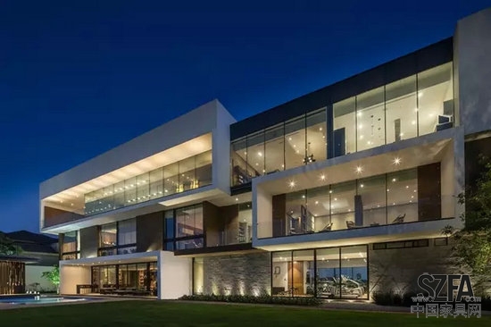在房屋的最頂層,有一些社交活動(dòng)區(qū)域。中間層主要功能則為起居生活,有一間大主臥,以及四個(gè)供孩子們和客人使用的寬敞房間。在房子的底層則為娛樂(lè)區(qū),泳池酒吧應(yīng)有盡有。