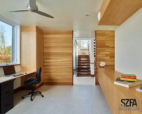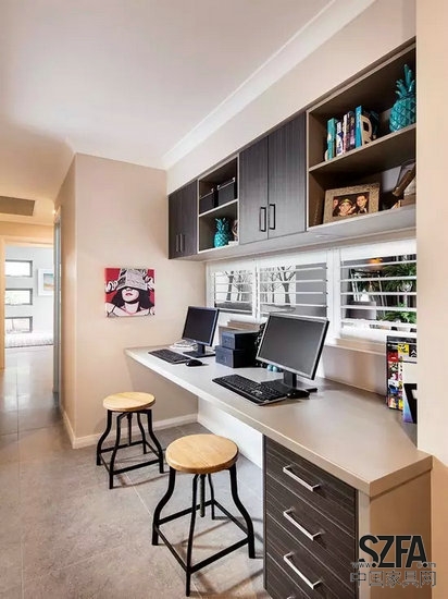 在家里的拐角處,依靠墻設(shè)計(jì)壁桌和壁柜造就舒適簡約的雙人辦公區(qū)。在過道的凹處,起到了很好的隔離作用。