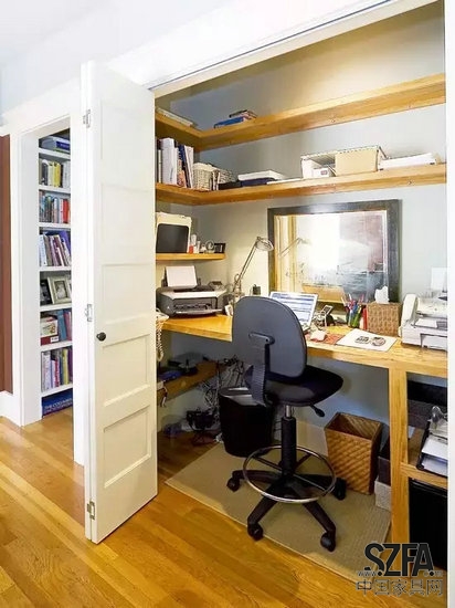塞進(jìn)衣櫥的書房,是不是前所未見?書房雖小,但五臟俱全。不用時(shí)以門關(guān)上,不影響過道的規(guī)整視覺感。