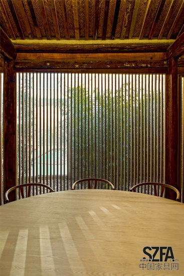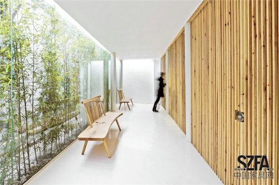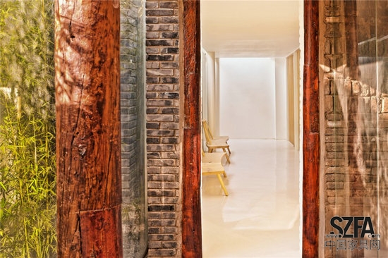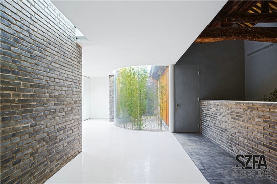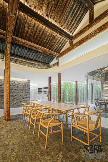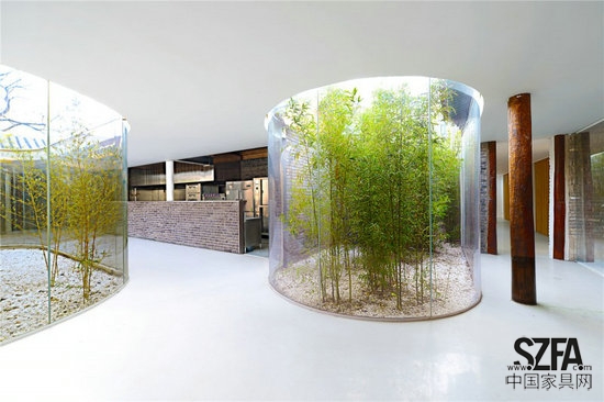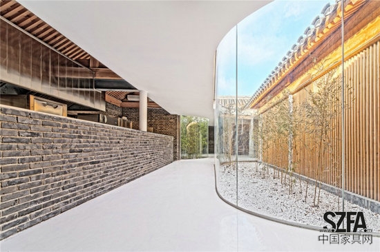 在傳統(tǒng)建筑中,廊是一種半內(nèi)半外的空間形式,它的曲折多變、高低錯落,大大增加了游園的樂趣。猶如樹枝分岔的曲廊從室外伸展到舊建筑內(nèi)部,模糊了院與房的邊界,改變院子呆板狹窄的印象。輕盈、透明、純白的廊空間與厚重、滄桑、灰暗的舊建筑形成氣質(zhì)上的反差,新的更新、老的更老,拉開時間上的層疊,新與舊相互產(chǎn)生對話。曲廊在原有院子中劃分了三個錯落的弧形小院,使每一個茶室有獨(dú)立的室外景致,在公共和私密之間產(chǎn)生過渡。曲廊的玻璃幕墻好似一個懸浮地面之上的弧形屏幕,將竹林景觀和舊建筑形式投射到茶室之中,新與舊的影像相互疊加。曲廊同時具有舊建筑的結(jié)構(gòu)作用,廊的鋼結(jié)構(gòu)梁柱替換了局部舊建筑中腐朽的木材,使新與舊“長”在了一起。