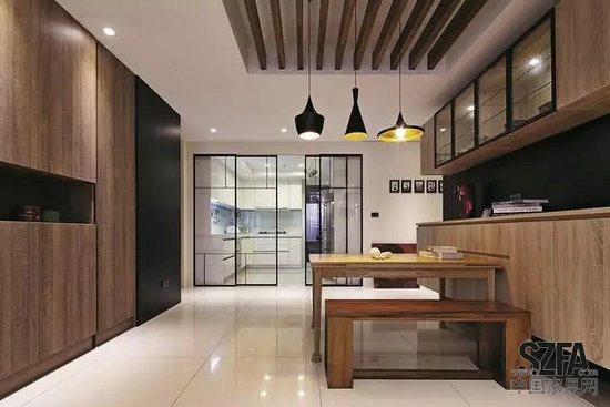 餐廳設(shè)計(jì)的非常簡(jiǎn)約現(xiàn)代化,暖黃色的燈管打落在深色木質(zhì)的餐桌上,氣氛非常溫馨而不落俗套。