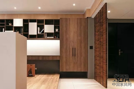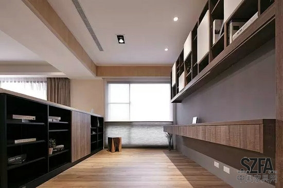 簡(jiǎn)約線條的書柜,咖啡色的背景墻,這一切看起來都非常有質(zhì)感。