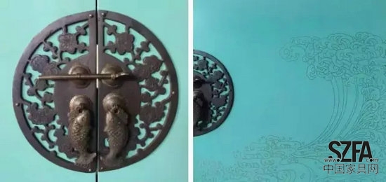柜面為青釉色的油漆打板,配上柜體絲印海浪紋圖案,正如在一片青綠之意中托出躍上水面的鯉魚(yú),暗合“鯉魚(yú)躍龍門”之意。據(jù)悉,該作品將會(huì)在本次的“大咖•軟飾設(shè)計(jì)櫥窗秀”中展出。