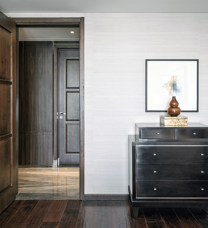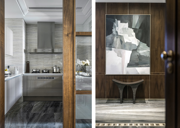 在大理石的“寡言”中,軟裝的舒適溫和了室內(nèi)空間:同樣是清冷的家具色調(diào)在紡織物的調(diào)節(jié)中,室內(nèi)變得溫暖而不是格調(diào)。家具線條纖細(xì)柔和,有美式的典雅也有東方的儒雅。色彩由白色過度到灰色再到深深的木制色系,徐徐漸進(jìn),消除過多的雜念。