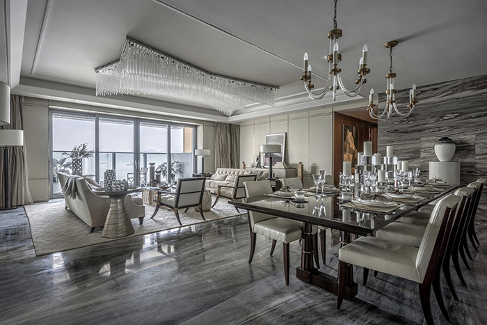 面臨大海,優(yōu)雅環(huán)境,所有的思緒都能平穩(wěn)下來。尚壹揚(yáng)陳設(shè)賦予了環(huán)境沉穩(wěn)內(nèi)斂的氣息,似乎鏈接了平靜的大海,將這種優(yōu)雅的術(shù)語醞釀其中。在整個(gè)空間中,沒有富麗堂皇的裝飾格調(diào),大理石紋理占據(jù)了主導(dǎo)地位。大理石本是靜態(tài)的實(shí)體,“無聲勝有聲”的氣勢(shì)氤氳其中。智者寡言,吐字成金,尚壹揚(yáng)陳設(shè)模擬出了大將泠然的氣派。