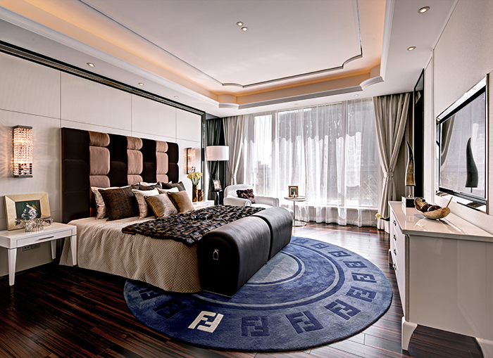 主人房甄選FendiCasa的高背床,再搭配“雙F”字母LOGO手工地毯,成為整個(gè)居室提亮色調(diào)的點(diǎn)睛之筆,更顯時(shí)尚奢華品味。棕色系的高背床本身就是空間的一個(gè)裝飾亮點(diǎn),恰到好處的拼接和色彩搭配,既引人注目又不張揚(yáng),完美詮釋了FendiCasa的奢華質(zhì)感。書(shū)房九宮格掛畫(huà)中細(xì)致復(fù)雜的圖案和線條豐富了空間元素,簡(jiǎn)約的深色書(shū)桌及柜體與掛畫(huà)形成對(duì)比,整個(gè)書(shū)房顏色高度統(tǒng)一,彰顯無(wú)與倫比的高貴氣質(zhì)。