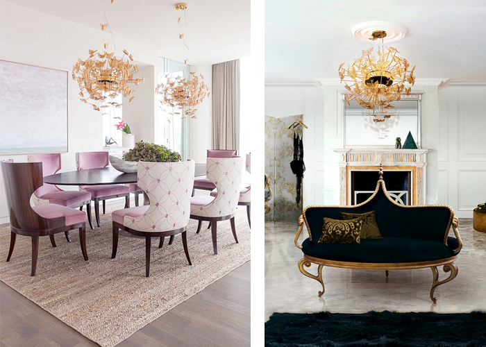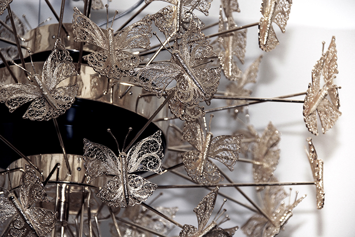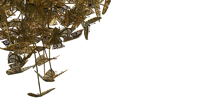 想象一群異域風情的蝴蝶翩翩飛舞,這就是Nymph吊燈的靈感來源。這群優(yōu)雅的蝴蝶飛舞的姿態(tài)被KOKET用金銀絲勾勒出來,每一只蝴蝶都是由大師級別的工匠純手工制造,這是最無與倫比并且獨一無二的藝術品。