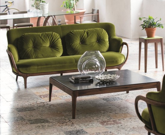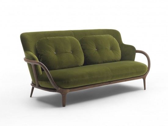 Sofa with frame in solid canaletta walnut and removable cover in the fabrics of the collection. Two feather filled back cushions included. It is possible to combine different fabrics for seat and cushions.