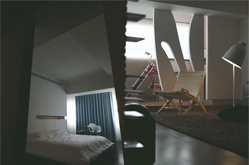 以溫潤木質(zhì)和黑色酷勁的視聽設(shè)備形成對比,亦強化出火紅色音響的狂放熱情。