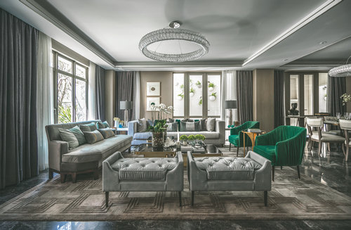 客廳與餐廳的設計中,高貴的氣質在祖母綠與高級灰結合的剎那占領整個空間,在溫潤如玉的質感與盈透的色澤中,彰顯著無與倫比的誘惑魅力。 她說:我想要讓身處其間的人,在妙曼的視覺感受之后,發(fā)現(xiàn)有某些元素能夠觸碰我們內心的原點。配合著極簡的設計構思,餐廳室內空間設計在材質的鋪陳和搭配上表達了現(xiàn)代設計的特質,祖母綠的餐具與精致的花藝點綴于餐桌上,使得空間層次分明。聚會廳的空間中,溫潤的黃翡色澤介入,材質的混搭與精致的工藝形成一場精心的鋪排,簡潔有力的設計語言,抽象的藝術畫與精致雅趣的飾品在同一空間并置。在聚餐廳,你可見獨具風情的鉚釘元素餐椅,來自歐洲的復古家具,宛若白流蘇一般的水晶吊燈,圖案獨特的地毯與精美的花藝,交疊出藝術的格調。
