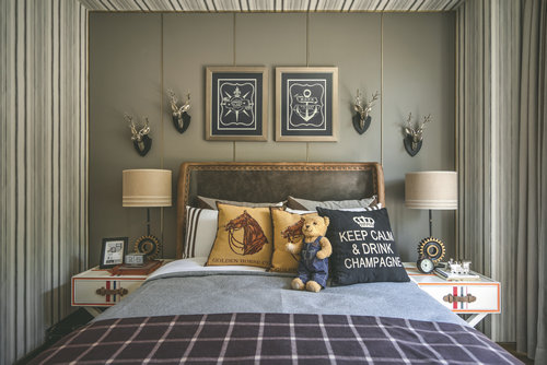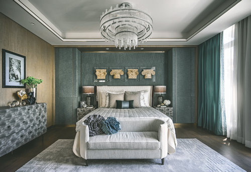 二層、三層為不同主人的臥室空間,均以營造靜謐為前提,用不同程度的灰色糅合現(xiàn)代風尚,在內斂與品質之外,加入異域元素的融入。家庭廳在舒適和藝術之間達到共振,圓形沙發(fā)與白色皮質單椅的圍合,讓家人相處的時間融洽自然,墻面掛飾稍作點綴,地毯仿佛一幅裝飾畫,大面積提升空間的裝飾感。主臥休息室主調為灰色,整體空間莊重內斂,銅質飾品的介入,形成一脈形成的藝術感。主臥的設計中,設計師將古舊粗獷的古羅馬建筑元素提煉成了床頭的藝術裝置,用精巧的方式將宏大的敘事載入空間,克制的色系與浪漫的表達形成了東方和西方的對話。次臥用不同程度的灰色糅合現(xiàn)代風尚,特殊定制的亞克力床頭和邊柜,空間中的掛畫、飾品以簡潔的形式呈現(xiàn),極致的簡練和輕盈的浪漫并存。男孩房以精致的格紋與幾何線條的延伸界定了空間的格調,歐洲建筑圖案為背景的單椅和精心布置的藝術品,讓空間更具情景化,純真浪漫。書房中,簡練的色調,奔放的斑馬紋地毯與精致的皮藝形成視覺上的張力,凸顯經(jīng)典與現(xiàn)代的交織感。