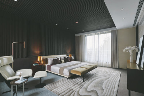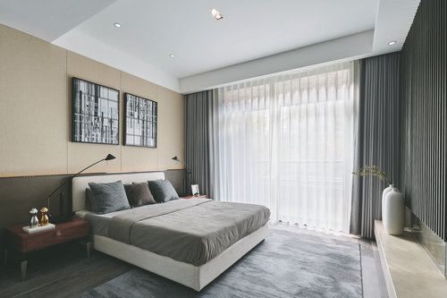 主臥立面及吊頂?shù)陌偃~元素與客廳餐廳立面和諧統(tǒng)一。水墨紋路地毯與自然光線融合,產(chǎn)生極富韻律的光影效果,令空間低調(diào)、怡心。在賦予空間沉穩(wěn)大氣的同時(shí),現(xiàn)代人追求的舒適靜謐也在這里得到滿足。