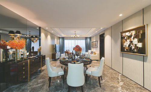 客廳及餐廳方正大氣,超豪華大面寬保證了充足的采光與景觀視野面。在一個手工羊毛地毯的裝飾下變得生動起來,別致的主題元素圖案,橙色和白色的家具搭配具有視覺沖擊力,整體視覺效果帶有一種戲劇性的色彩。餐廳高光黑檀餐桌金屬鑲邊貴氣且與餐椅的鉚釘相呼應(yīng)。高腳餐邊柜讓空間更通透又能起到防潮作用。精美的裝飾品,糅合出平衡典雅的用餐氛圍。