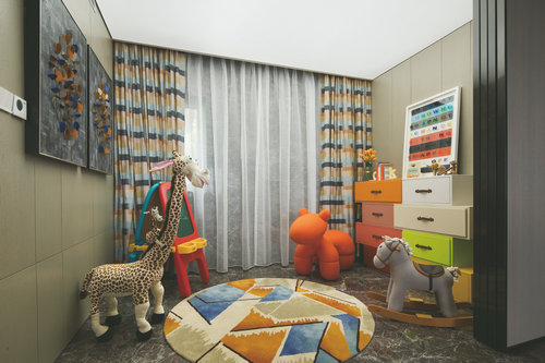 多功能房間設(shè)計為兒童玩樂區(qū)。色調(diào)溫馨。儲物柜的設(shè)計很簡單有型,給人一種時尚感,同時也很有實用性。鮮艷的色彩,各種小動物,軟軟的地毯。讓小主人無憂無慮的享受玩耍時光。主衛(wèi)整體墻地面灰影大理石設(shè)計,空間簡潔大氣。綠色植物是生活的一部分,為家?guī)碜銐虻那逍屡c自然。