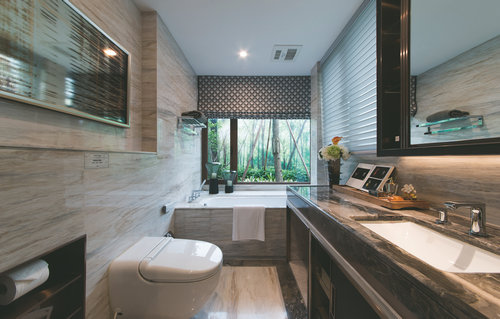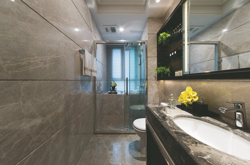 除此之外,陽(yáng)光、材料、飾品多種元素結(jié)合在一起,達(dá)到一種平衡并且互相映襯的美學(xué)效果。書(shū)房的設(shè)計(jì),充分利用了窗戶(hù)的采光,小小的陽(yáng)臺(tái)供閱書(shū)或工作疲倦之時(shí)的稍作休息已足夠。地板沿用了伊斯灰大理石,延續(xù)整體空間的設(shè)計(jì);而采用“雪印象”為墻面石材,則是強(qiáng)調(diào)視覺(jué)上的開(kāi)闊,與地面形成對(duì)比。鏡面柜的小物品陳設(shè)錯(cuò)落有致,更顯空間井井有條。