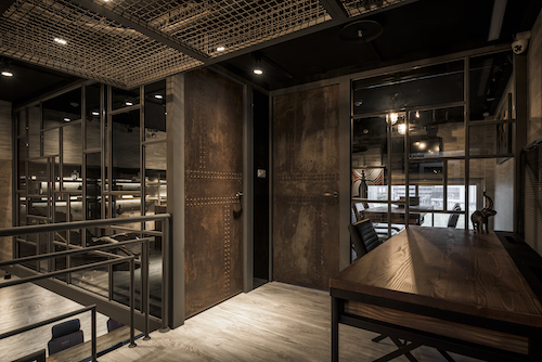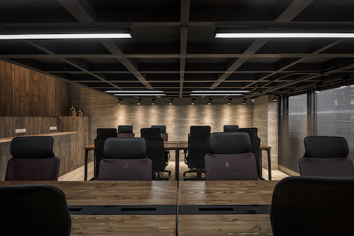 挑高部分以不規(guī)分割的造型金屬框、交錯(cuò)分布的清玻、黑玻、管線(xiàn)延伸的設(shè)計(jì)手法延伸視覺(jué)高度及空間寬闊感。藉由自然光線(xiàn)、柔黃色調(diào)的燈光解決一致性色調(diào)帶來(lái)的冰冷感,并將燈具在不同區(qū)域依空間屬性有所不同,挑高空間以垂吊型式的裸露燈泡外罩玻璃罩并藉由玻璃隔間的反射特性呈現(xiàn)公共區(qū)域的大器與沉穩(wěn)質(zhì)感,將空間質(zhì)感細(xì)細(xì)體現(xiàn)。