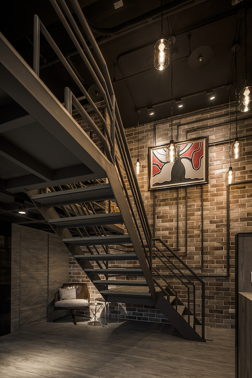 門(mén)片以鐵門(mén)仿制銹鐵的斑駁感再以鉚釘裝飾,家具部分以原木色為基底,結(jié)合黑色、咖啡色、白色…等色,結(jié)合工藝手法使家具襯托出空間的強(qiáng)烈質(zhì)感;部分以材質(zhì)處理呈現(xiàn)復(fù)古的斑駁質(zhì)感;部分延伸樓梯扶手的管線(xiàn)重新組構(gòu)等展現(xiàn)LOFT風(fēng)格的粗獷感。
